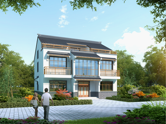 規(guī)劃農(nóng)房戶型以兩層獨(dú)立式住宅為主,總建筑面積為不超過(guò)280平方米。采用兩坡頂?shù)男问剑m當(dāng)錯(cuò)落。建筑主色調(diào)為黑白灰,門(mén)窗主色調(diào)為棕色木紋。