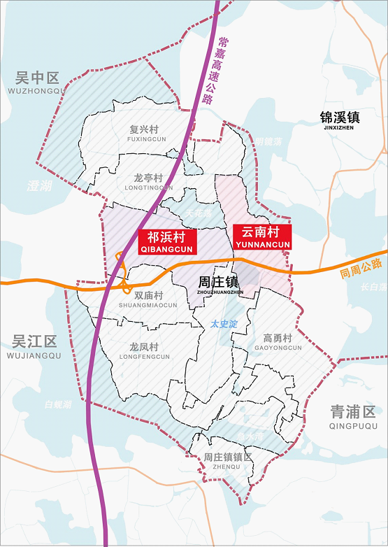 祁浜村、云南村位于周莊鎮(zhèn)域中部,西側(cè)緊鄰蘇州吳中區(qū),東側(cè)與錦溪鎮(zhèn)相連,同周公路、常嘉高速公路貫穿村域,并在祁浜村西南側(cè)設(shè)有高速出入口。村域總面積約697公頃。