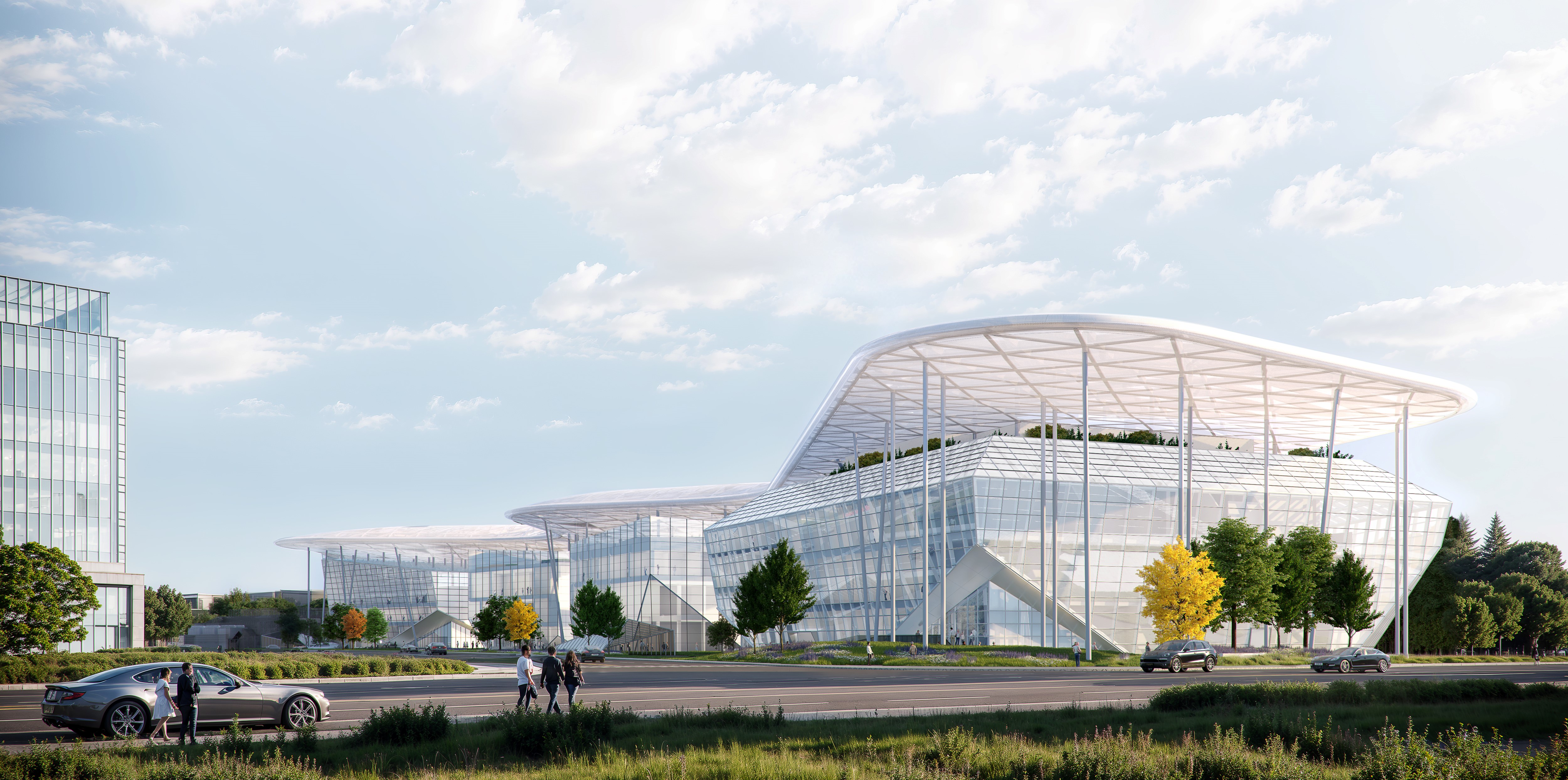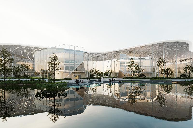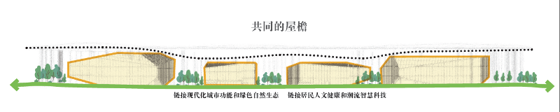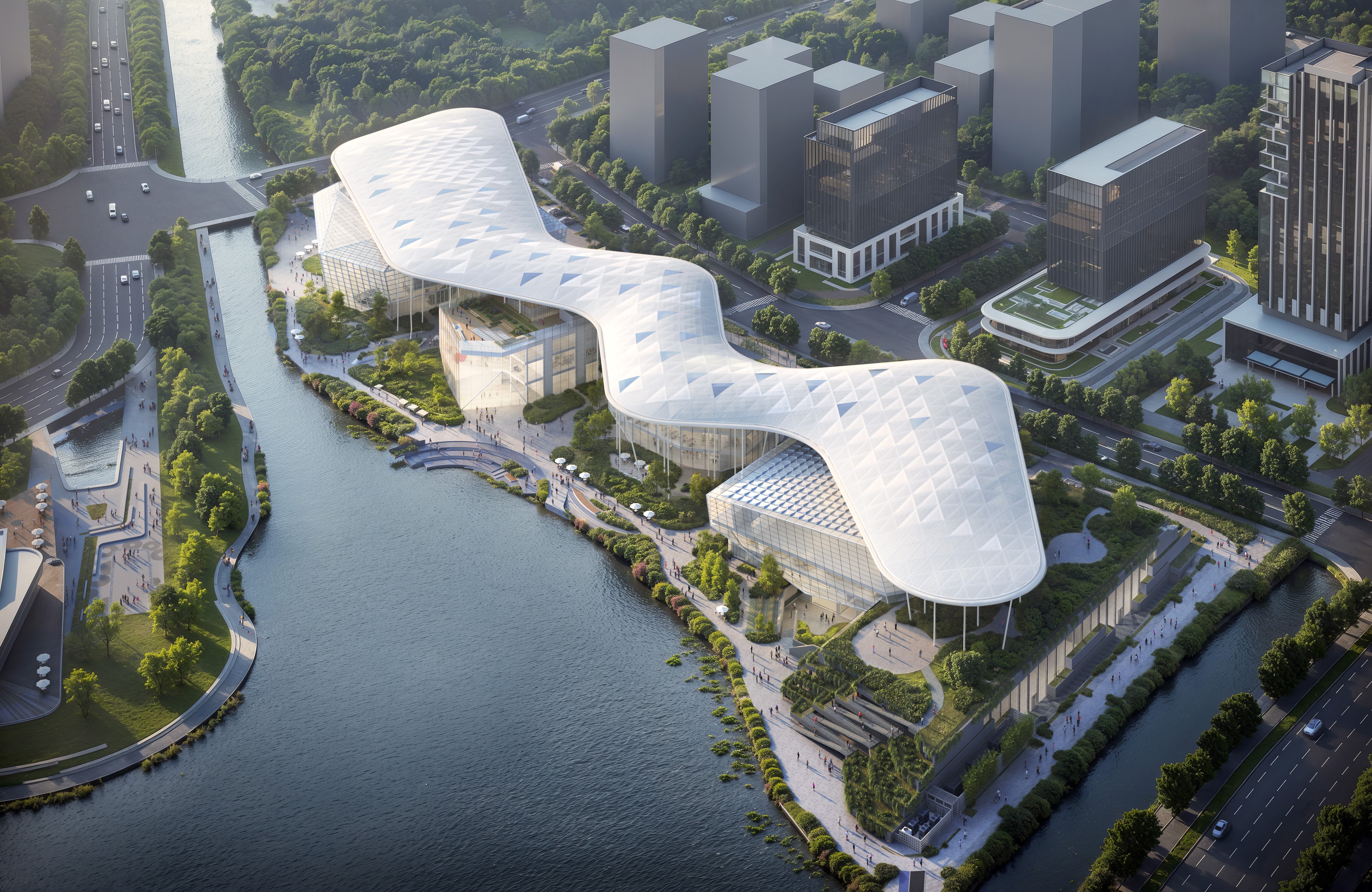 四個建筑單體自北向南分別為體育館、綜合館、文化館、影劇院,容納體育、商業、文化、演藝功能,場地上設置各類活動場地、濱水空間、多層次綠色開放空間,營建充滿活力的24小時城市客廳。