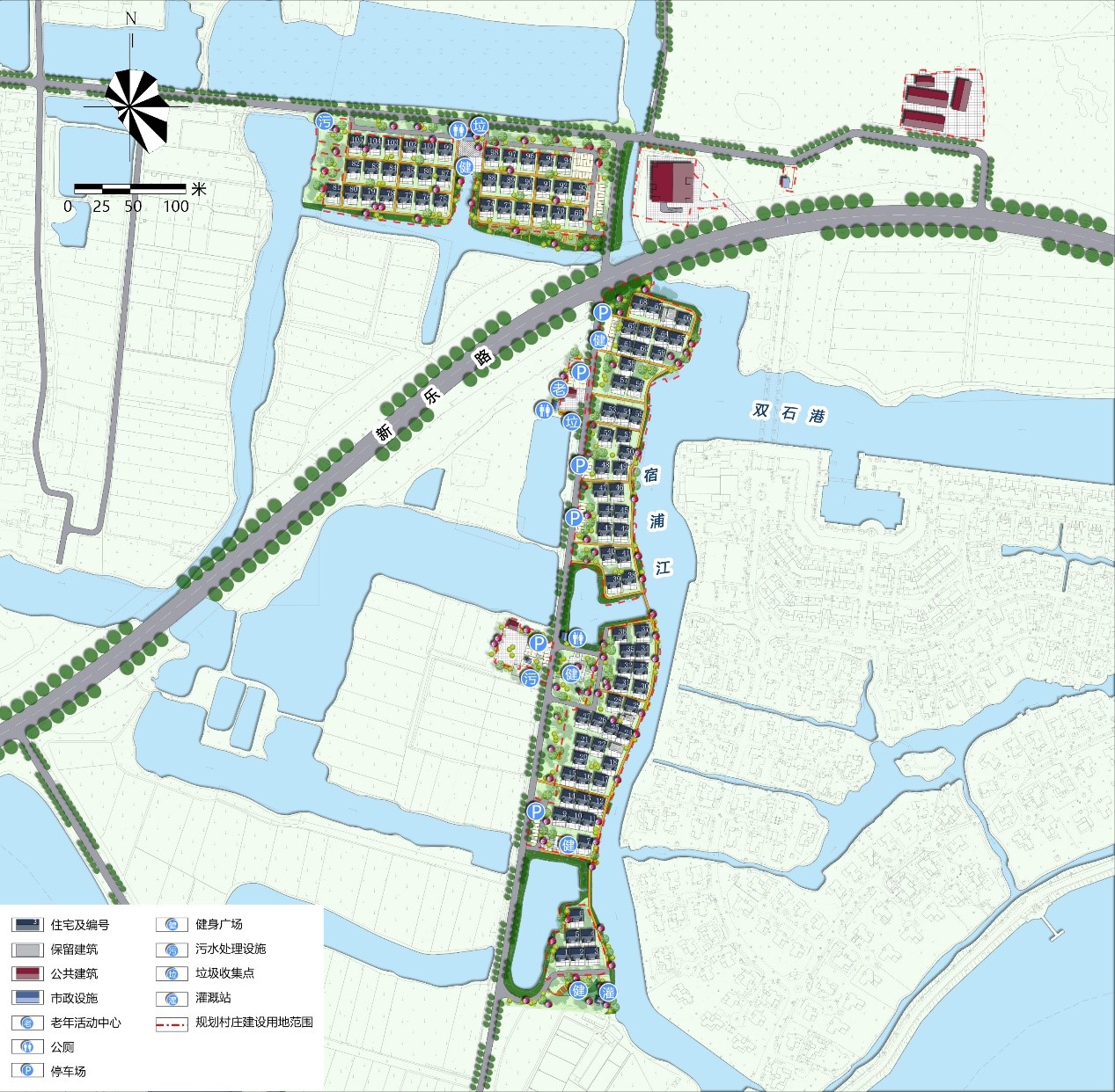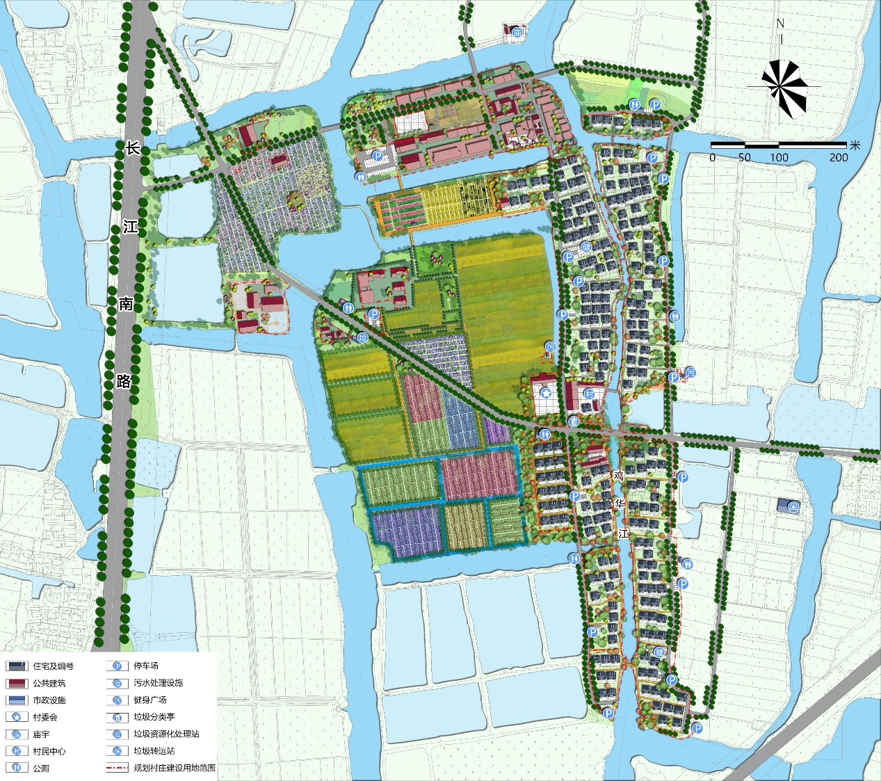兩軸:依托長江南路、新樂路串聯各個分區,打造村莊發展軸;