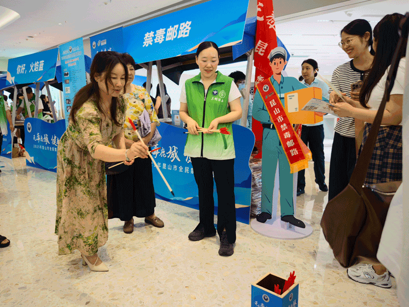 在“無毒鹿城、健康人生”2025年昆山市全民禁毒集中宣傳活動現場上,市禁毒辦聯合檢察、司法、郵管等部門,通過設立禁毒特色剪紙、漆扇禁毒書畫、仿真毒品模型展示等主題攤位以及現場互動體驗的形式,面向群眾科學普及禁毒知識,廣泛傳播“健康人生、綠色無毒”理念。