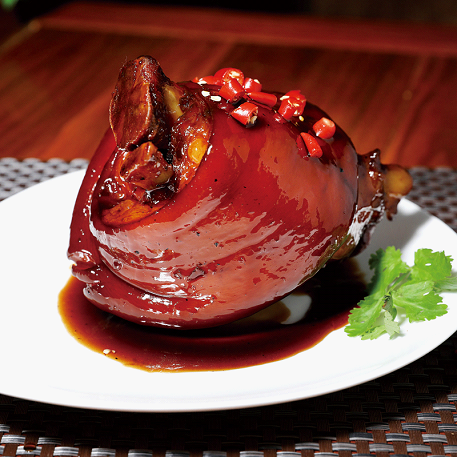 Wansan Pork Knuckle is a must-have cuisine in Zhouzhuang. The dish was created by the family of Shen Wansan (1330-1379), a wealthy businessman from the Ming Dynasty. When local residents prepare a banquet for distinguished guests, celebrate a festival or hold a wedding ceremony, this signature dish would always be served. Wansan Pork Knuckle needs to be stewed with eighteen seasonings for several hours so that it becomes soft and succulent, but not heavy. They present a beautiful balance between flavor and color, and encompass the auspicious meaning of good luck.