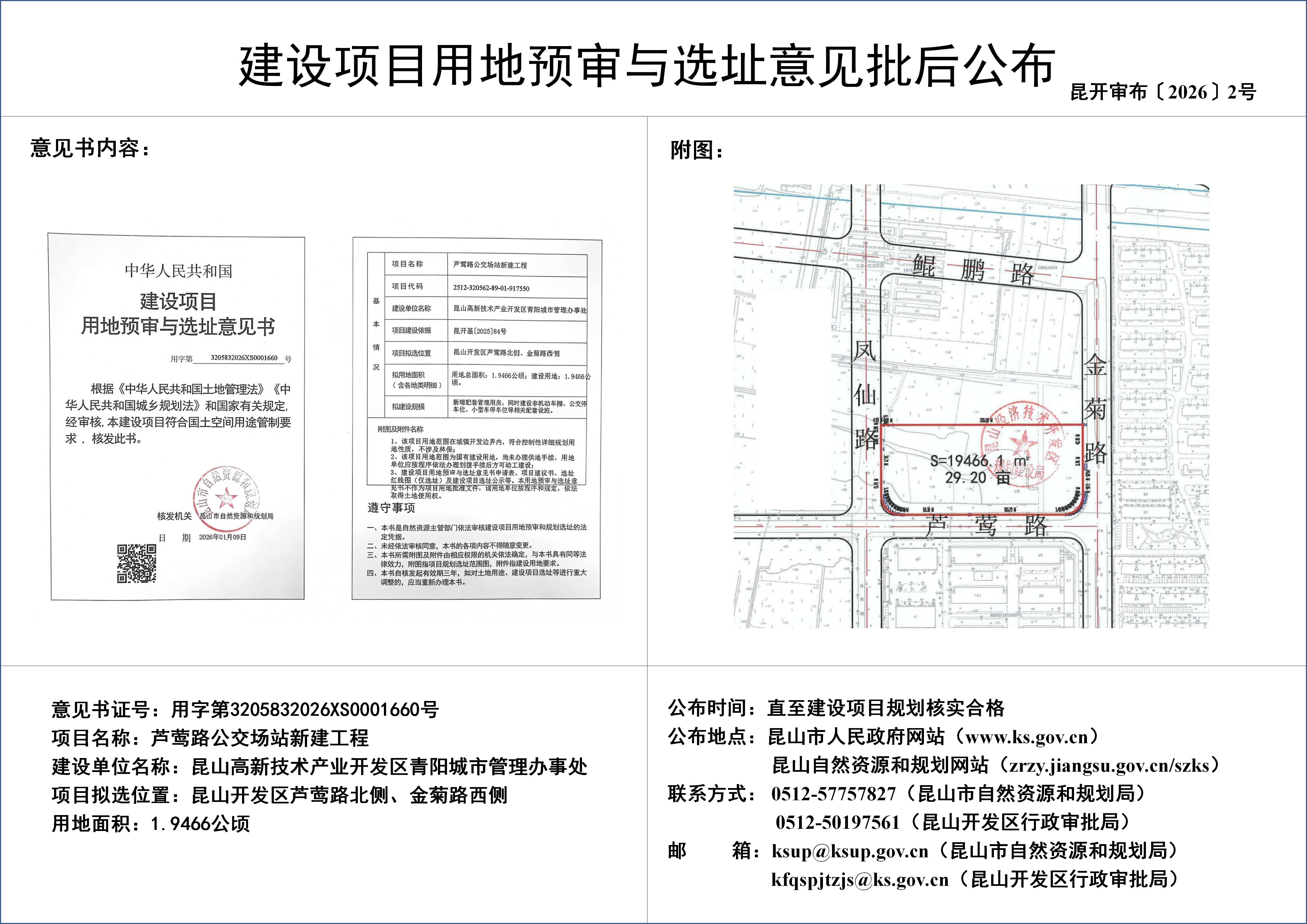 昆山高新技術產業開發區青陽城市管理辦事處蘆鶯路公交場站新建工程建設項目用地預審與選址意見批后公布