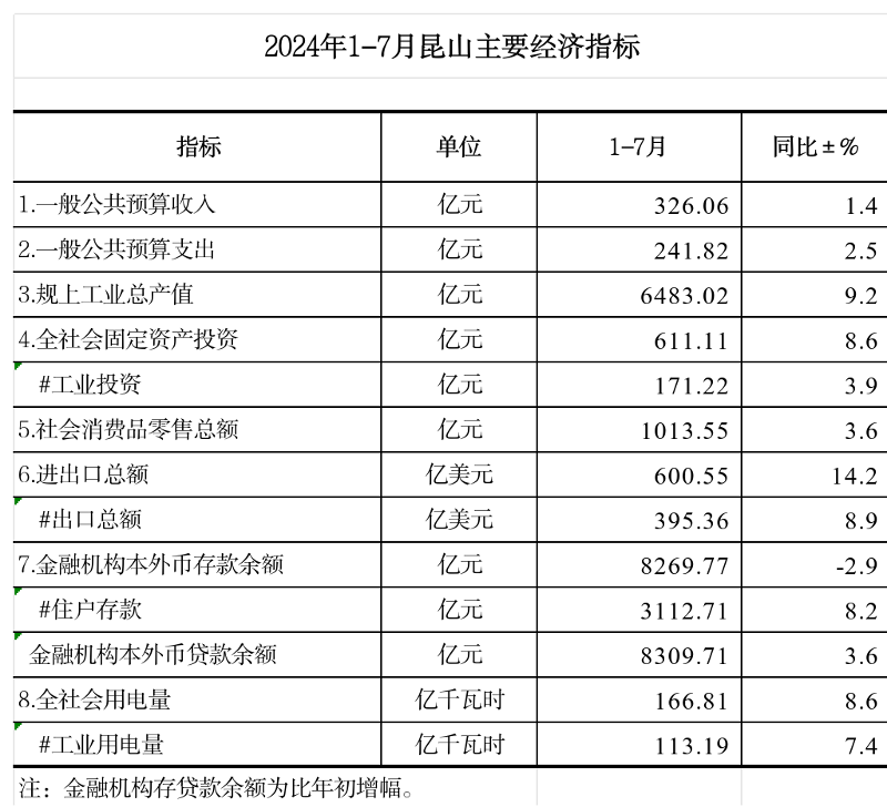 2024年1-7月昆山主要經濟指標