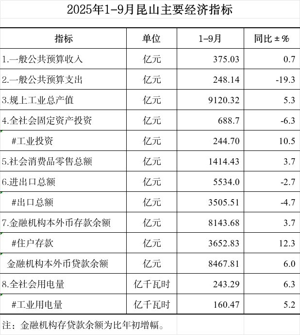 2025年1-9月昆山主要經濟指標